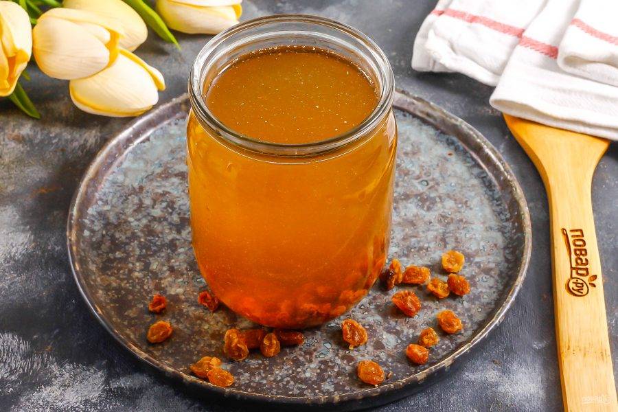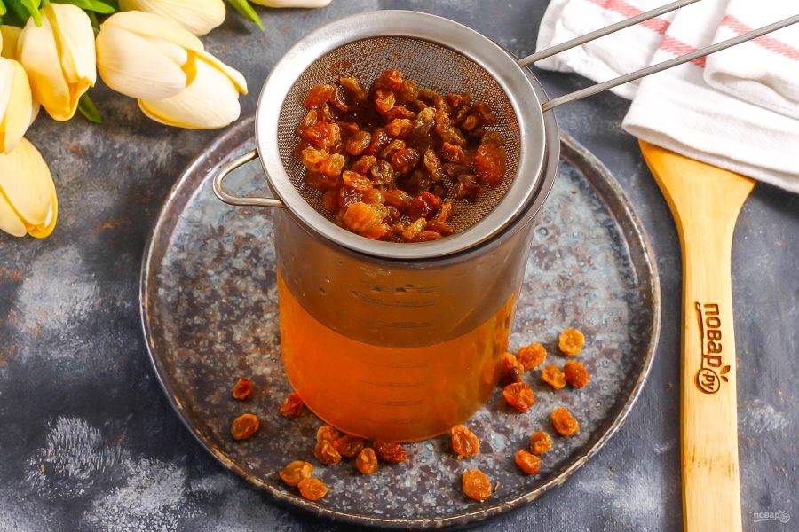 Выложите на изюм мед. Не используйте гречишный, он слегка горчит и придаст горечь напитку.