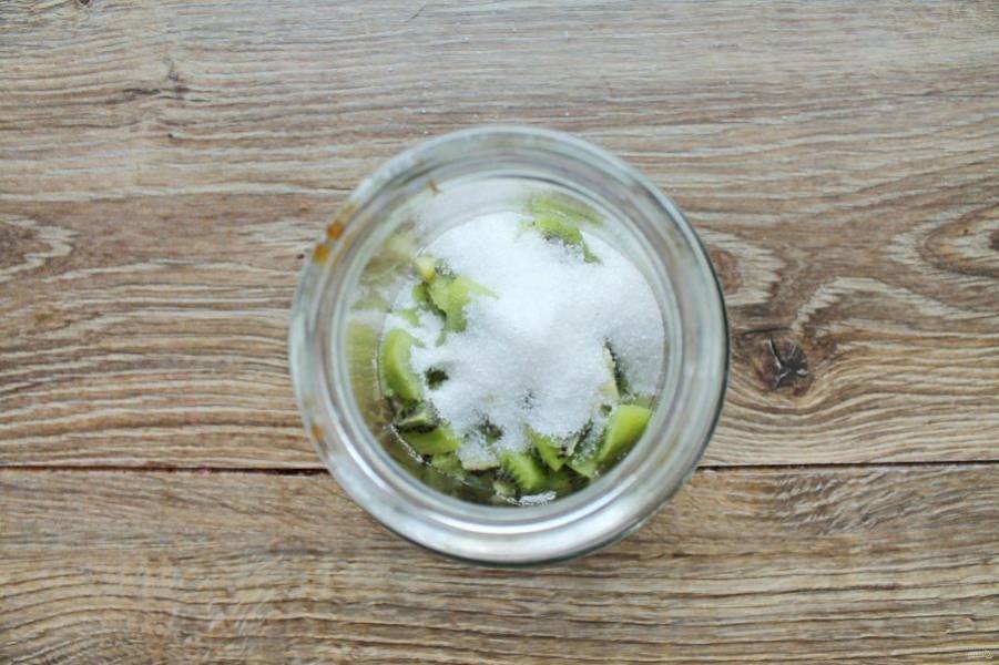 Всыпьте в банку с киви сахар.
