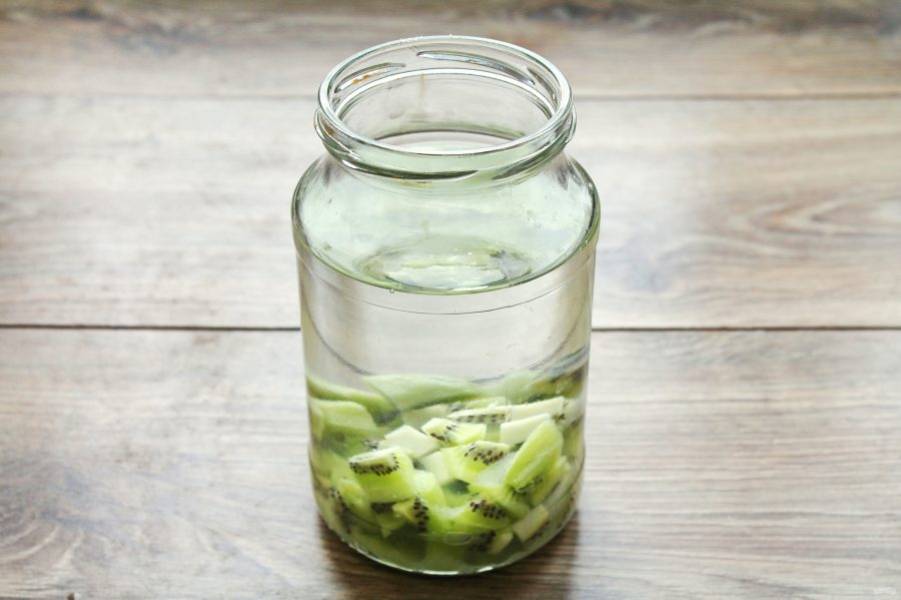Киви тщательно вымойте и очистите от кожуры. Порежьте плоды на мелкие кусочки и выложите в чистую, сухую банку.