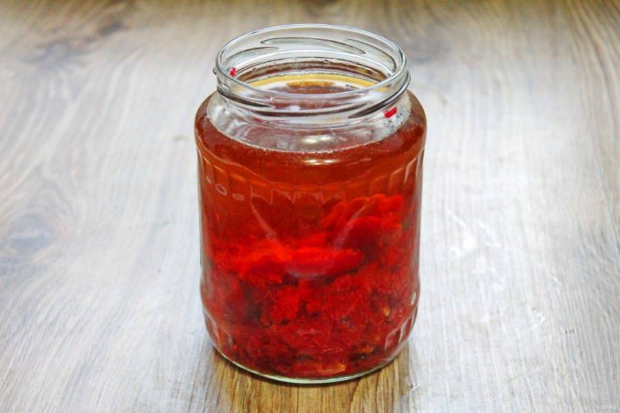 Добавьте в банку мед и перемешайте до растворения меда. Плотно закройте банку и уберите в темное, холодное место на 3 месяца. Затем настойку процедите, разлейте по бутылкам и охладите.