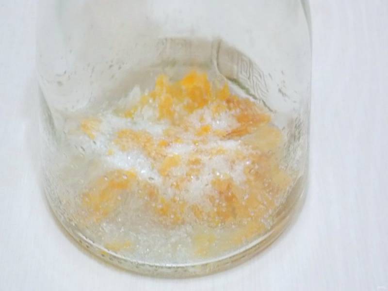 В чистую и сухую бутылку всыпьте сахар и цедру апельсина.