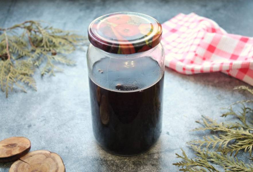 Влейте в банку коньяк и все хорошо перемешайте. Банку плотно закройте и уберите в темное, прохладное место на два месяца.