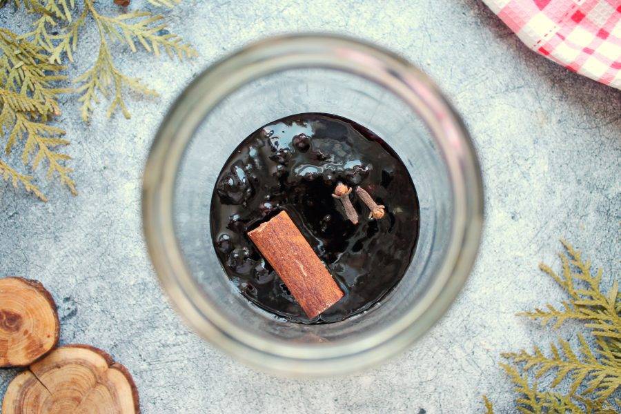 В сухую и чистую банку выложите варенье из смородины, добавьте палочку корицы и бутоны гвоздики.