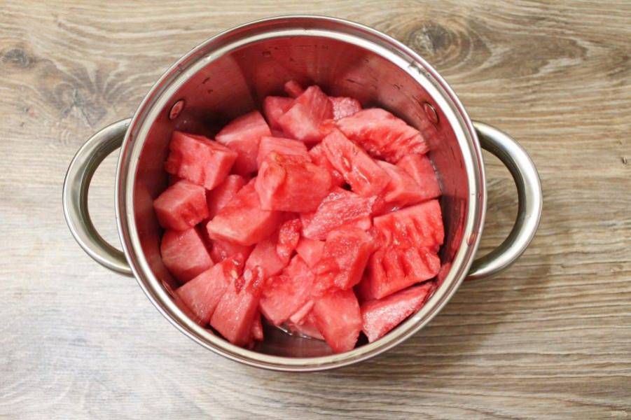 У арбуза удалите корку с белой частью и все зернышки. Порежьте его на куски и сложите в кастрюлю с толстым дном.