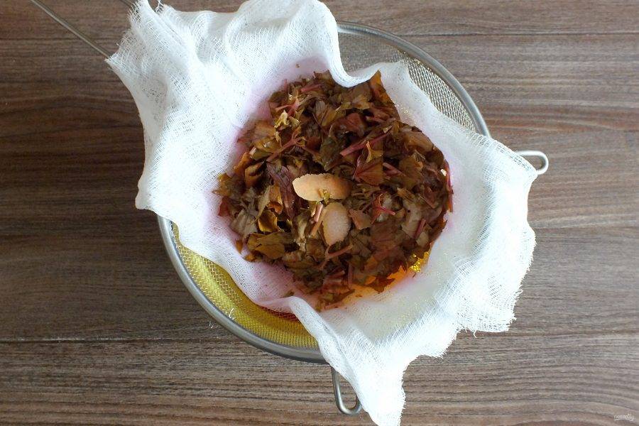 Сито застелите несколькими слоями марли, процедите чрез него напиток. Содержимое марли отожмите. Если вы хотите дополнить настойку сахаром, в процеженную часть добавьте указанное количество и хорошо перемешайте.