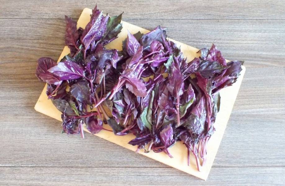 Базилик вымойте. Разложите на доске, чтобы он подсох.