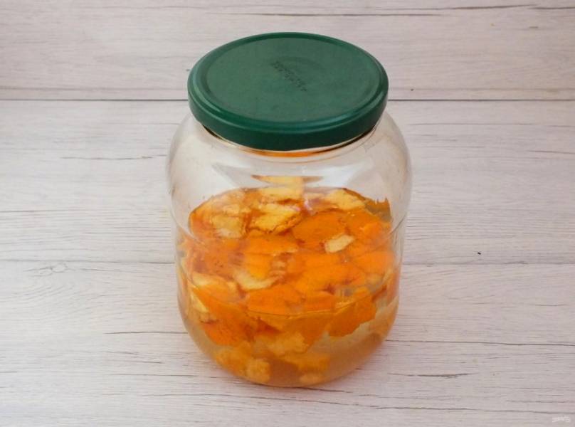 Профильтруйте настойку, уберите корочки. Перелейте напиток в бутыль. Уберите в холодильник на неделю. После напиток готов.