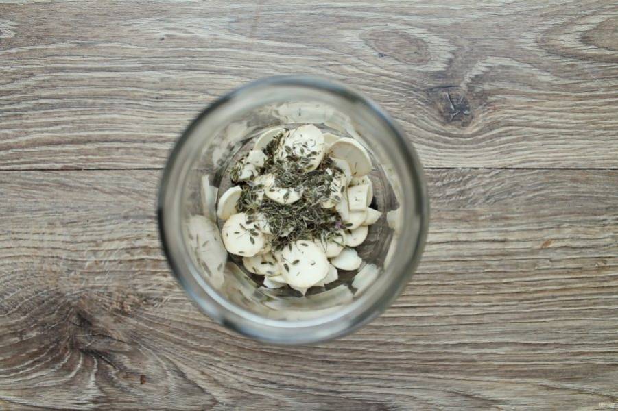 Добавьте в банку порезанный хрен и семена укропа.