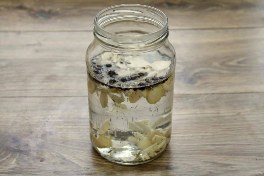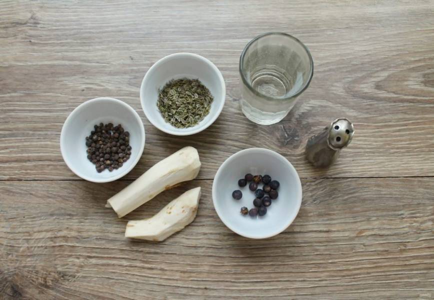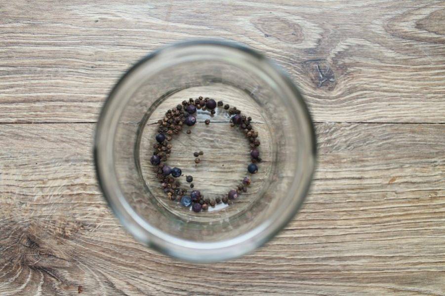 В чистую сухую банку выложите черный перец, ягоды можжевельника.