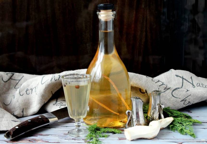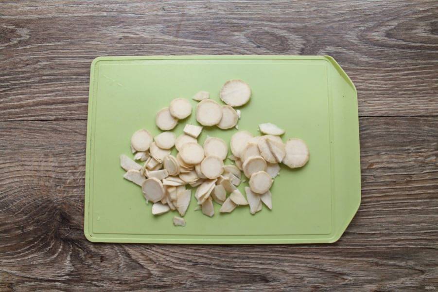 Корень хрена очистите, вымойте и порежьте тонкими кружочками. Оставьте в разложенном состоянии на два часа, чтобы немного подсох.