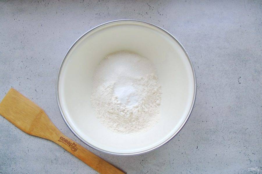 В миску насыпьте муку, сахар и разрыхлитель.