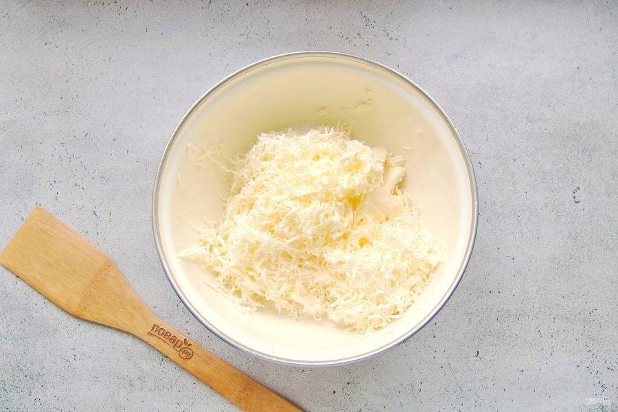 В миску с мукой, сахаром и разрыхлителем натрите на терке холодное сливочное масло.