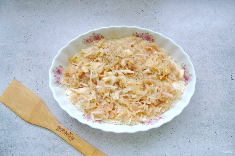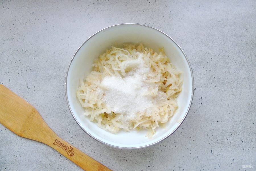 Груши помойте, очистите и натрите на терке. Добавьте сахар и перемешайте.