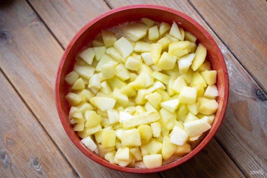 Яблоки почистите от кожуры, удалите семенной отдел и мякоть нарежьте небольшими кусочками.
