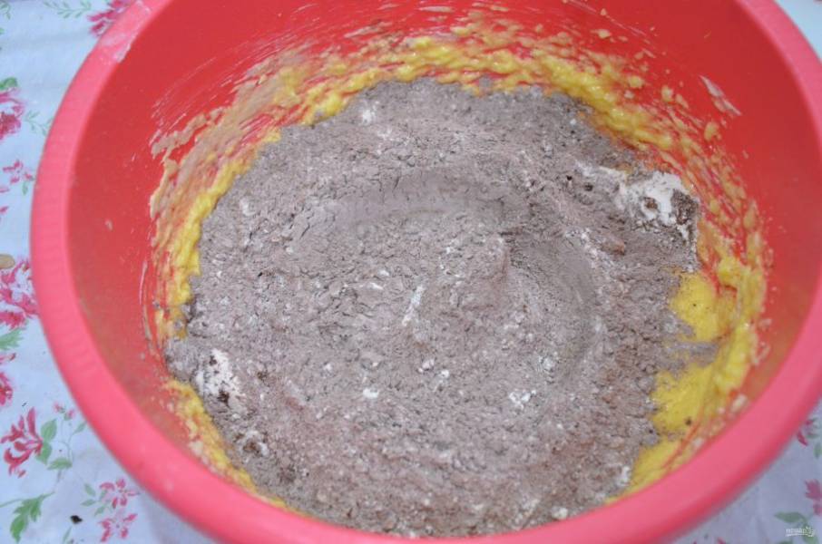 В отдельной посуде просейте и тщательно смешайте все сухие ингредиенты. Всыпьте в яичную массу сухие ингредиенты. Аккуратно перемешайте.