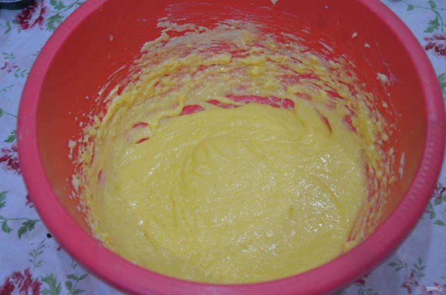 На высокой скорости разотрите сахар с маслом (3-5 минут). Добавьте по одному яйца, еще раз хорошо взбейте.