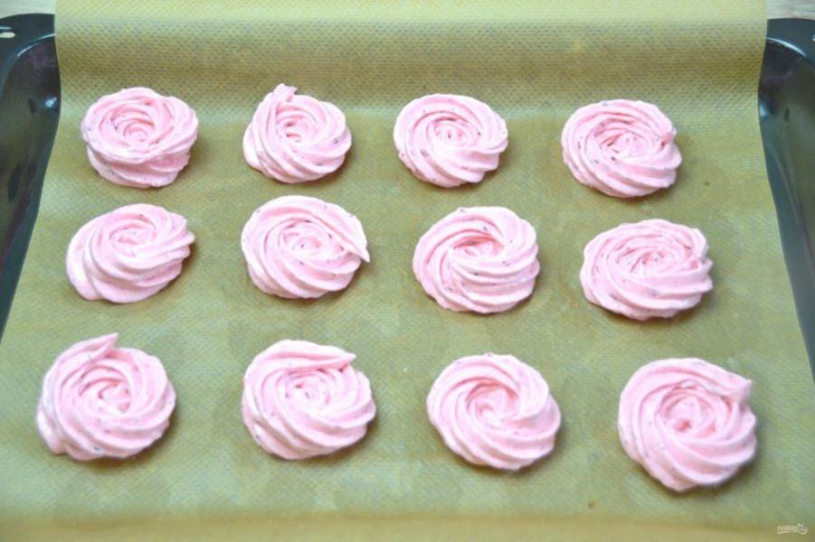 Отсадите зефир на пергамент. Подготовьте заранее 2 стандартных противня, именно столько потребуется для такого количества зефирной массы. Оставьте зефир на просушку, на это уйдет не менее 6 часов. Время сушки зависит от качества используемого агар-агара.