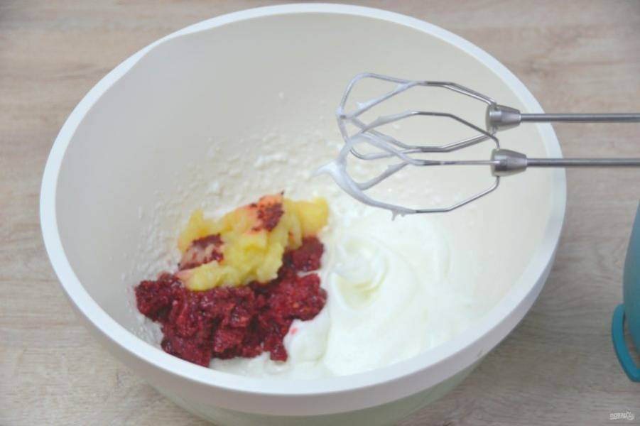 Взбейте сначала белок в пышную пену. После этого добавьте в белок клюквенно-яблочное пюре.
