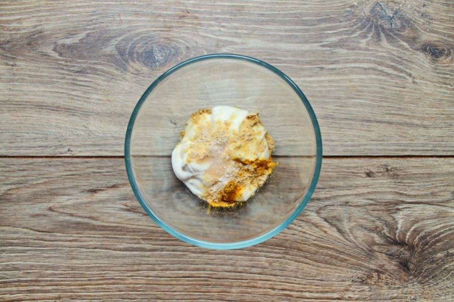 В миску смешайте сметану, соль, горчицу и куркуму до однородной массы. Влейте воду и перемешайте до однородности.