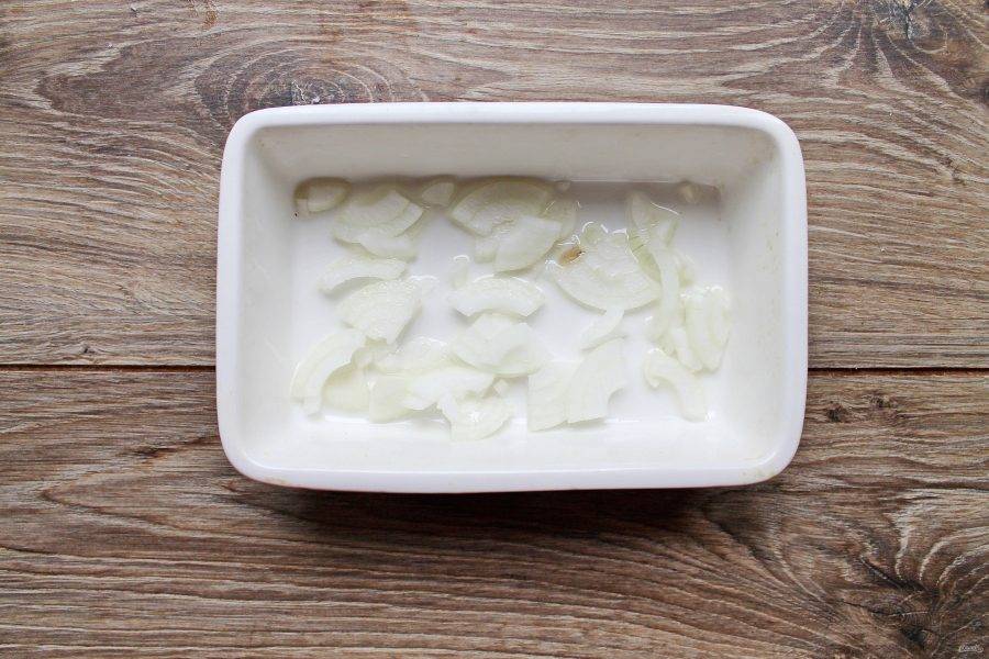 Лук и чеснок мелко порежьте и выложите на дно формы.