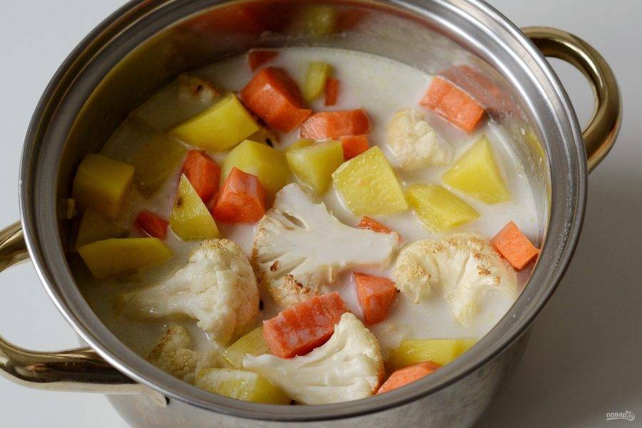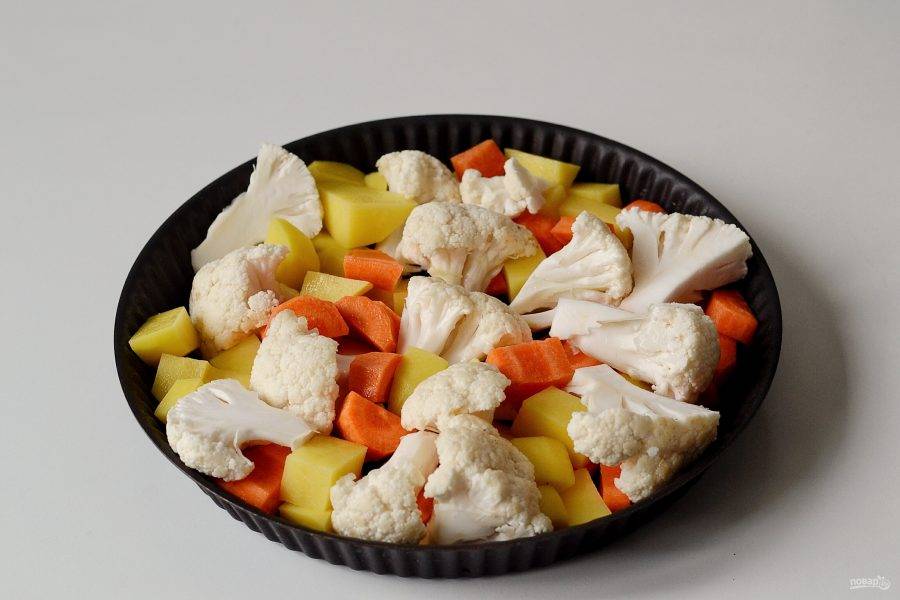 Картофель и морковь нарежьте аккуратными дольками. Цветную капусту разделите на соцветия. Запеките в духовке почти до готовности.