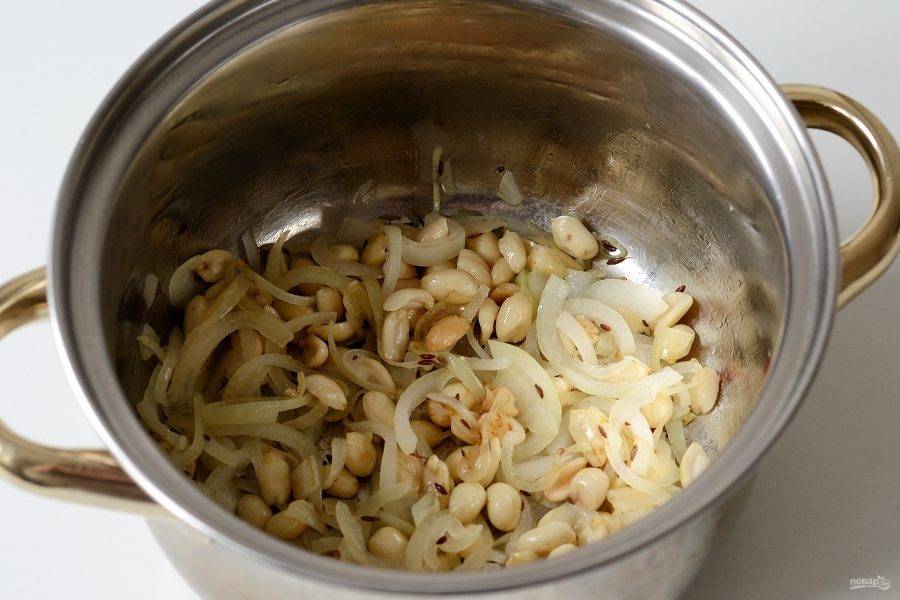 В сковороде разогрейте масло, добавьте семена зиры. Жарьте, пока зира не начнет шипеть. Добавьте нарезанный лук полукольцами и орехи. Обжаривайте около 3 минут.