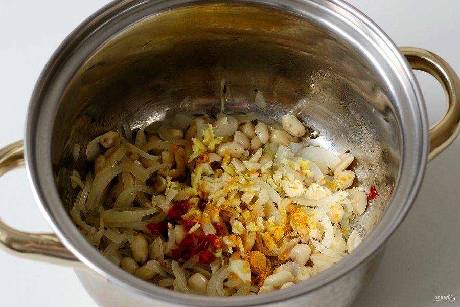 Добавьте тертый имбирь, перец чили и чеснок. Всыпьте куркуму и перемешайте. Обжаривайте еще 2 минуты.