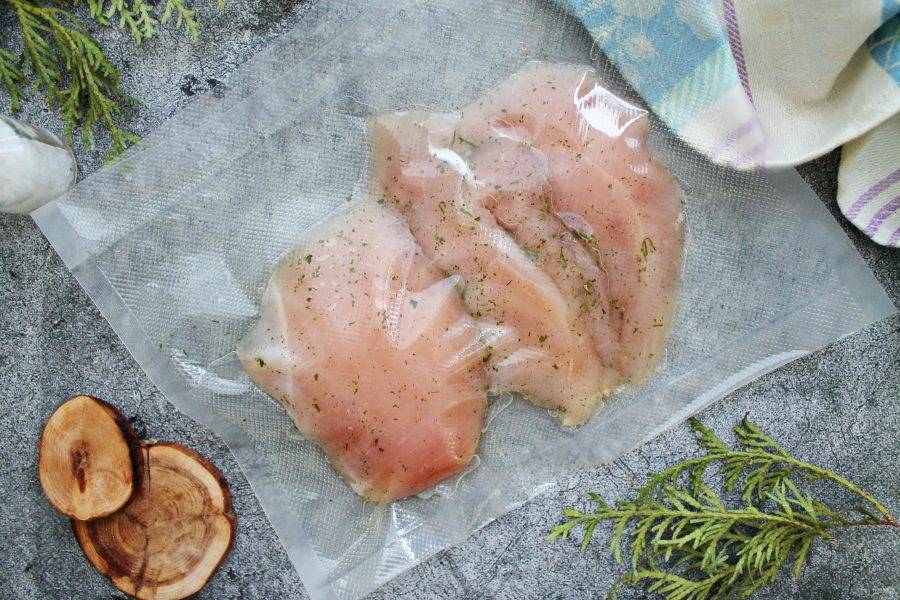 Выложите грудку в пакет для вакуума без масла. При помощи вакуумного упаковщика запечатайте филе.