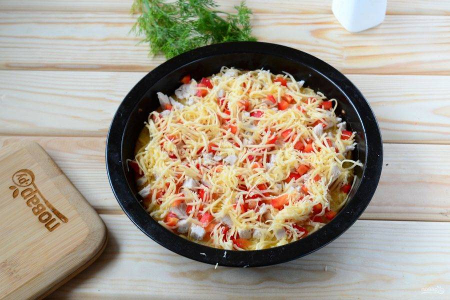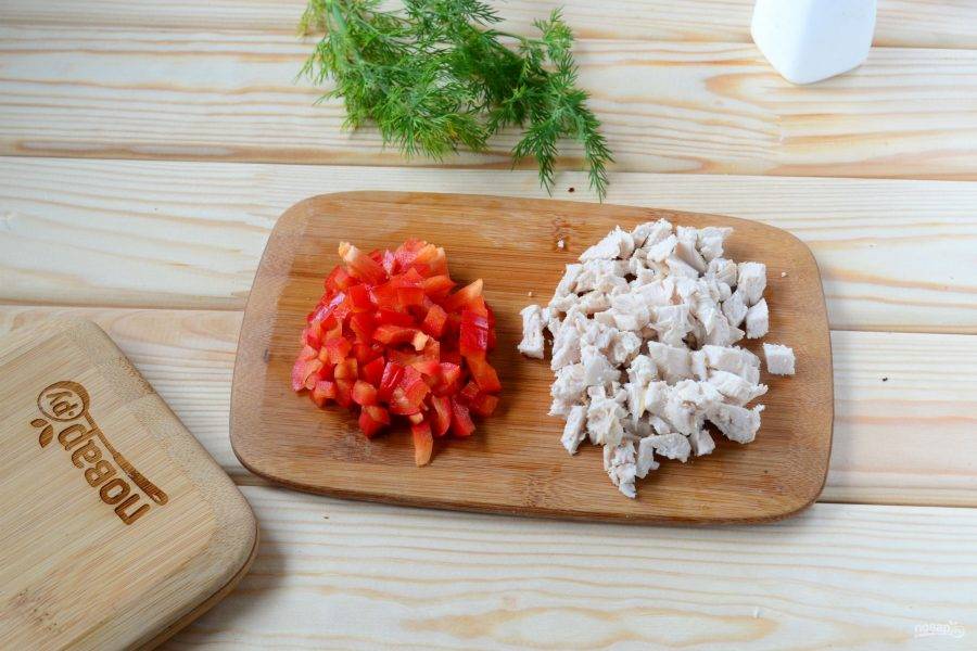 Тем временем подготовьте начинку. В принципе, начинку можете брать любую, но если вы хотите сделать полностью в соответствии с принципами правильного питания, то не используйте майонез, колбасу и другие «вредности». В качестве начинки я беру отварную куриную грудку и сладкий перец. Можно также использовать помидор, консервированную кукурузу и другие овощи.