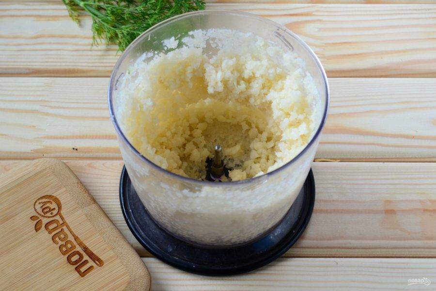 Начните с приготовления основы. Для этого измельчите в блендере или кухонном комбайне цветную капусту до состояния кашицы.