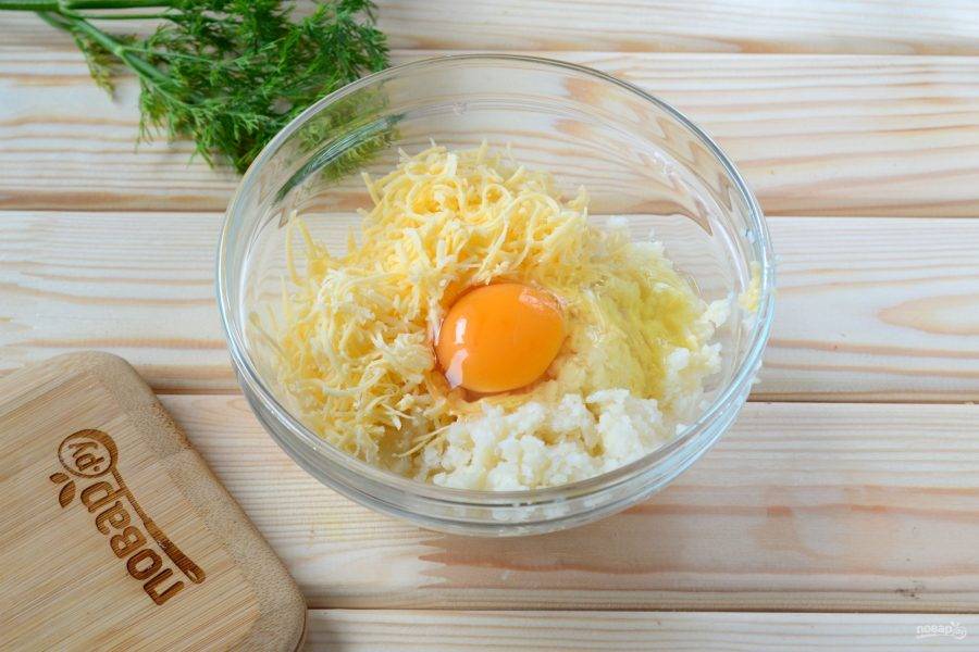 Смешайте цветную капусту с натертым на мелкой терке твердым сыром и яйцом. Посолите по вкусу. Все хорошенько перемешайте.