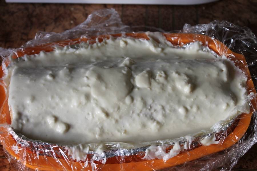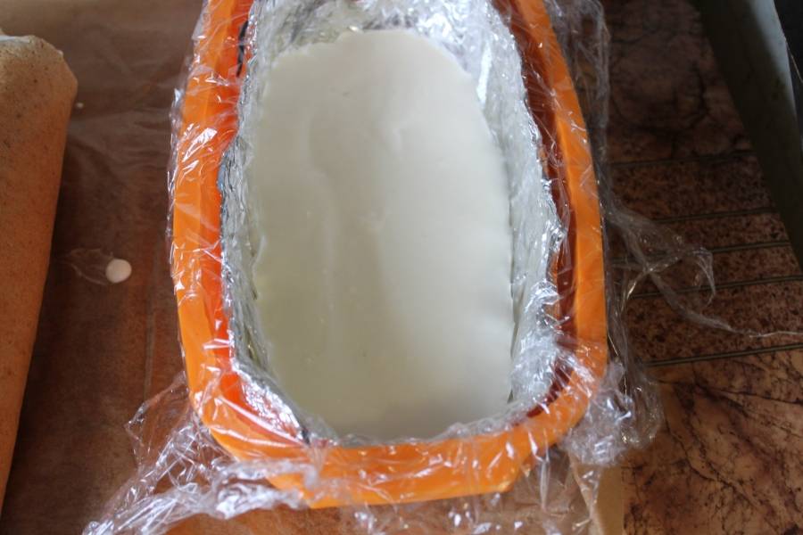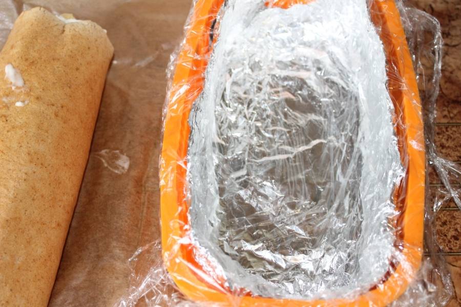 Готовим форму для заливки рулета. У меня была силиконовая, для придания ей жесткости я сделала внутри каркас из нескольких слоев фольги. Форму необходимо выстлать изнутри пищевой пленкой