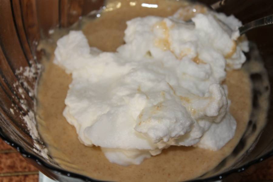 добавляем муку, перемешиваем взбиваем белки до крепких пиков и добавляем в миндальное тесто аккуратно методом складывания, Кстати по пути делююсь секретом взбивания белков. Совсем не обязательно их сильно охлаждать, или добавлять соль. Главное условия хорошего результата: идеально отделить желтки, чтоб ни капли не попало в белок, идеально сухая и обезжиренная посуда и венчик. Начинаем взбивать с самой маленькой скорости, постепенно добавляя обороты до самой максимальной. И при соблюдении этих нехитрых правил у вас гарантированно все получится