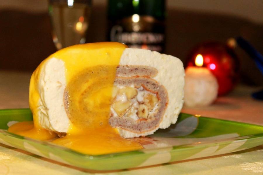 отрезаем кусочек, посыпаем сахарной пудрой, поливаем манговым соусом.