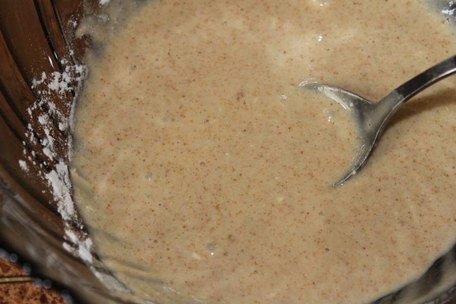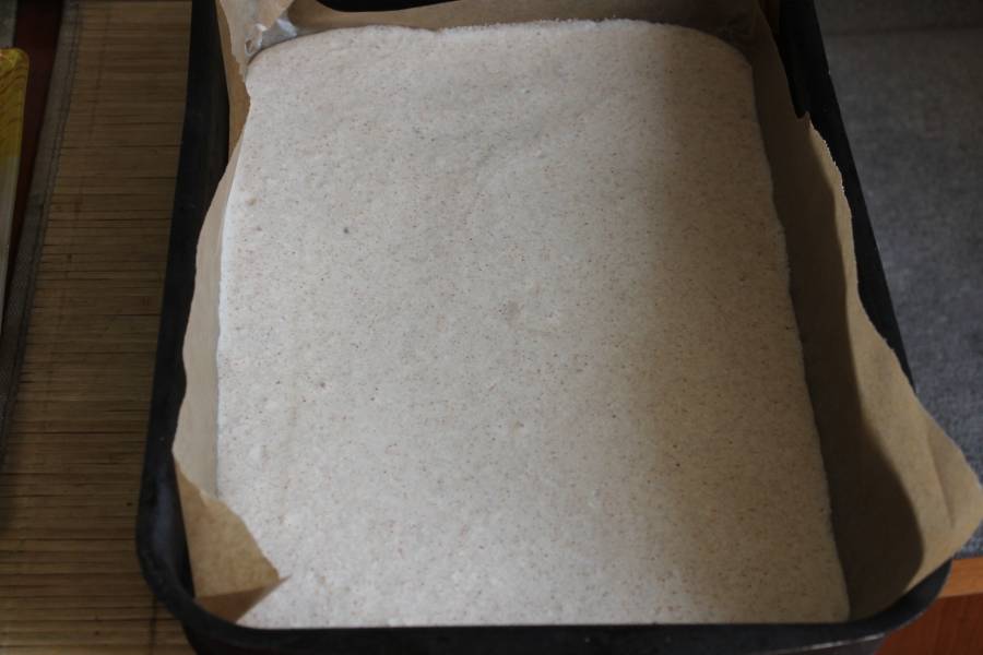 добавляем в наше тесто остывшее масло, перемешиваем, застилаем противень 40 на 30 пергаментом и выливаем тесто.