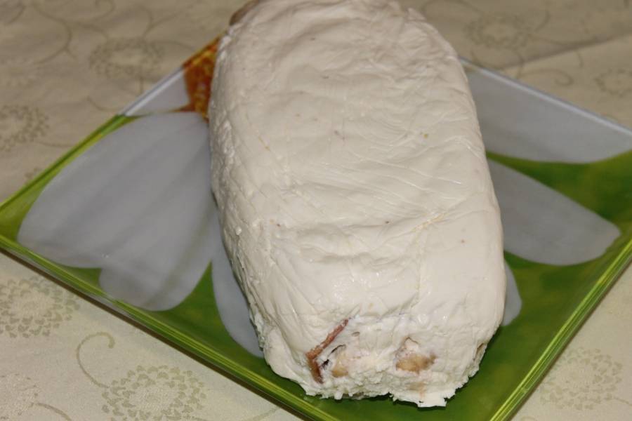 Переворачиваем десерт на блюдо, освобождаем от пленки