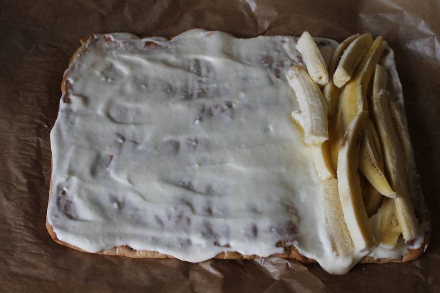 сливки взбиваем с сахаром до загустения, добавляем маскарпоне и еще хорошо вымешиваем частью полученного крема смазываем остывший рулет и выкладываем на него порезанные влоль на четверти бананы