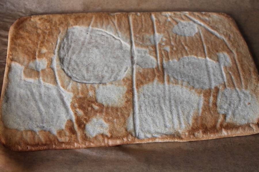 выпекаем бисквит при темп. 200 градусов в течение 12 минут. Переворачиваем наш выпеченный бисквит на чистый пергамент, а тот, на котором выпекали отлепляем. Почему-то в процессе выпечки он у меня пошел пузырями и вырисовался вот такой рисунок, но это не страшно, его никто больше не увидит))))))