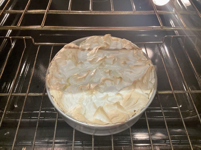 Достаньте торт из духовки, нанесите взбитые белки, силиконовой лопаточкой сделайте небольшие волны и пики. Поставьте еще раз в духовку на 5-10 минут, сильно румянить не следует. После выпекания не доставайте из духовки сразу, приоткройте дверцу и охладите прямо в духовке около 40 минут.