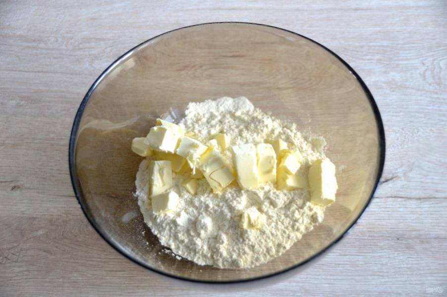 В миску для замешивания теста всыпьте муку, разрыхлитель, соль, смешайте. Добавьте холодное сливочное масло, измельчите руками в крошку. Старайтесь сделать это быстро, избегая длительного контакта масла с руками. Можно измельчить в блендере, или порубить ножом.