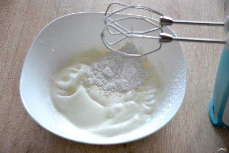 Взбейте белки в пышную пену. Затем добавьте сахарную пудру.