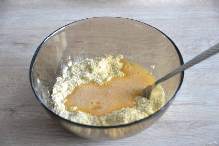 Влейте яичную смесь к смеси сухих ингредиентов, замесите тесто.