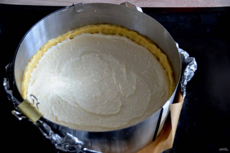 Распределите тесто в разъёмной форме (диаметром 23 см.), сформируйте бортики высотой примерно 4-5 см., достаточные для выкладывания творожной начинки и меренги.