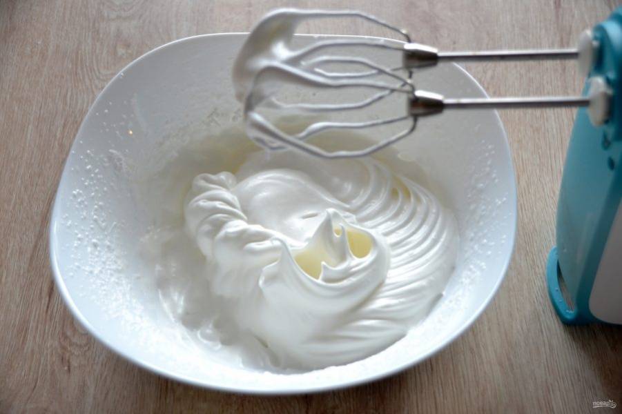 Взбейте белки с сахарной пудрой в стойкую пышную массу.