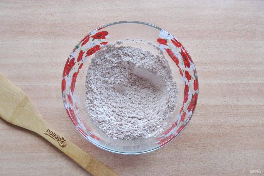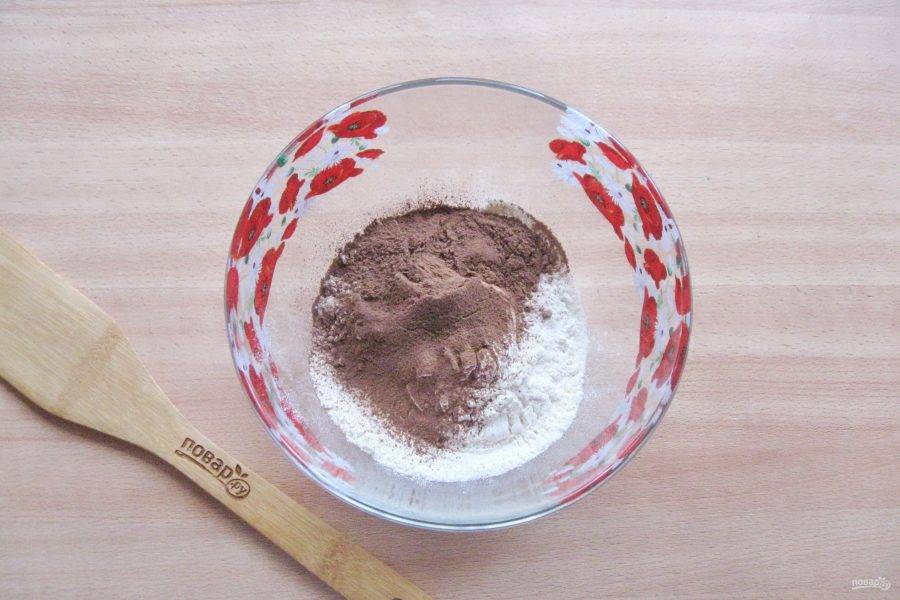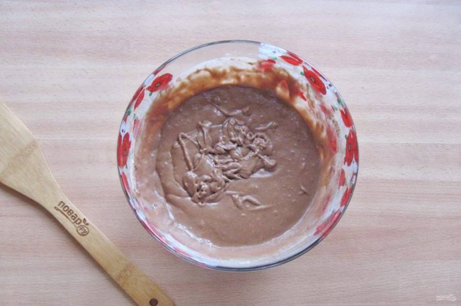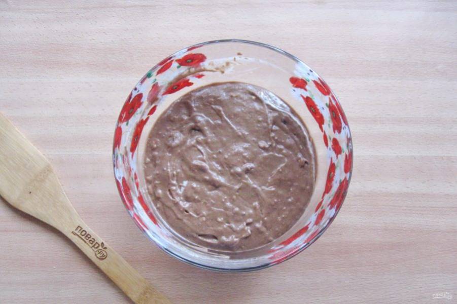 В миску с мукой и какао добавьте соду, погашенную уксусом или лимонным соком. Затем постепенно влейте белки с сахаром, желтками, маслом и молоком. Замесите однородное, гладкое тесто.