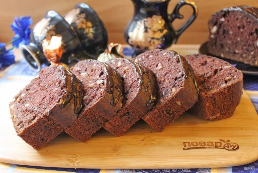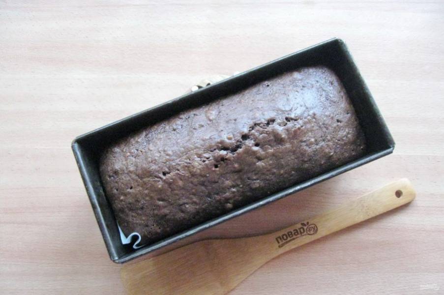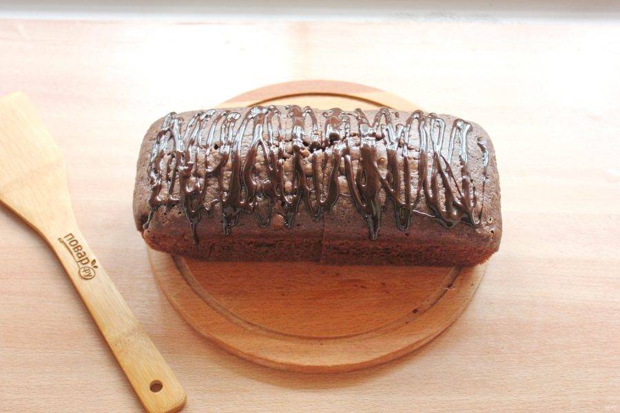 Дайте кексу остыть и достаньте из формы. Растопите шоколад и полейте им кекс.