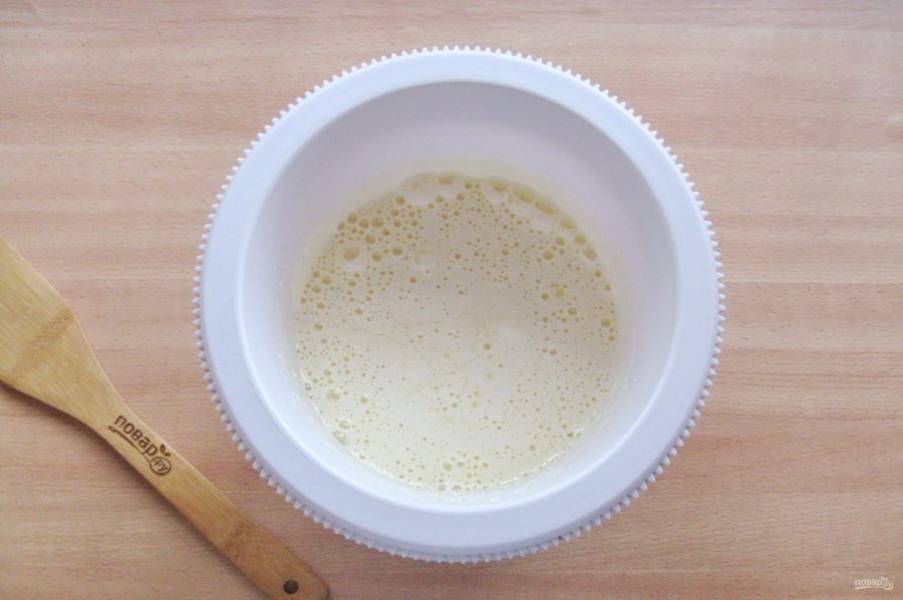 Аккуратно перемешайте белки с сахаром и желтки. Сливочное масло растопите, немного охладите и влейте туда же.