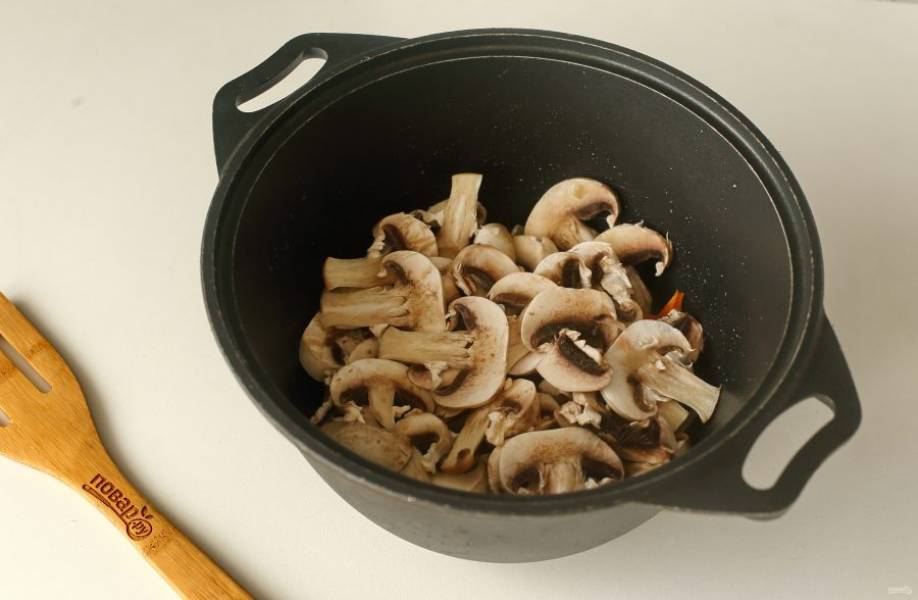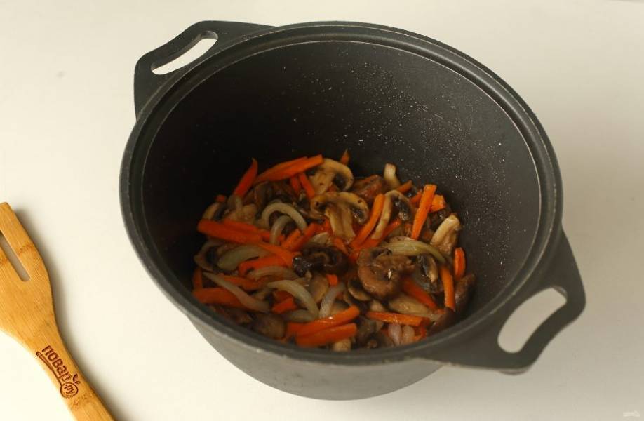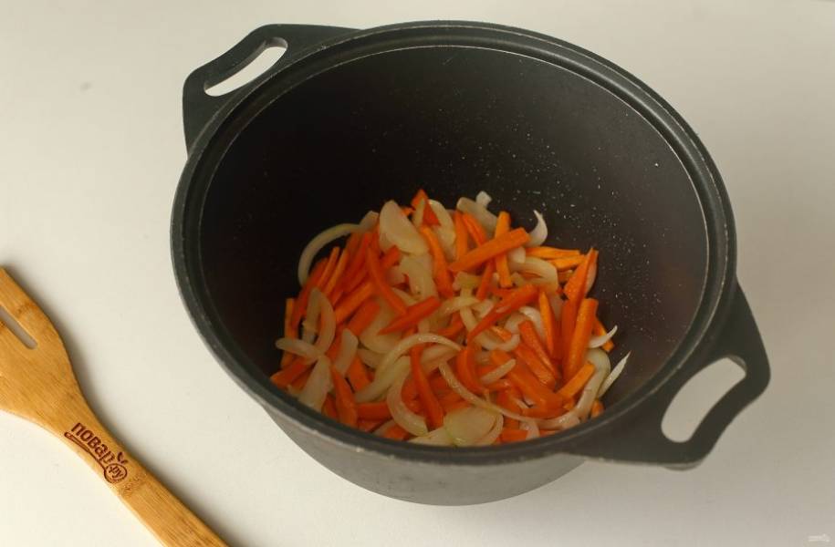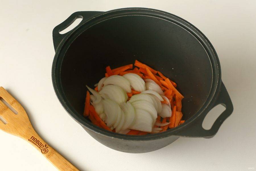 Налейте в казан масло и прогрейте его. Выложите нарезанную соломкой морковь и нарезанный перьями лук.