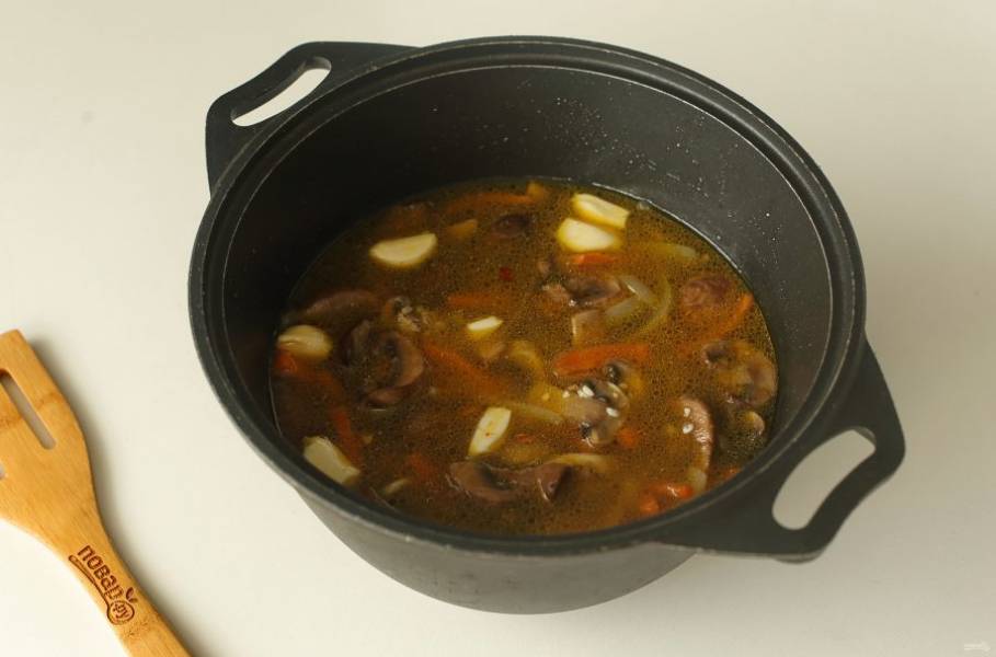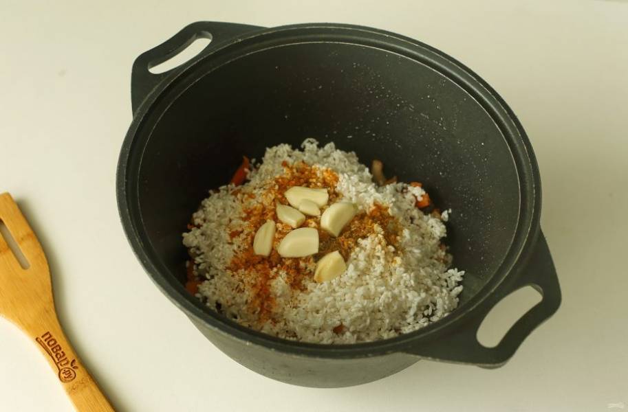 Добавьте промытый рис, очищенные зубчики чеснока, соль и специи по вкусу.