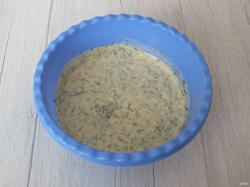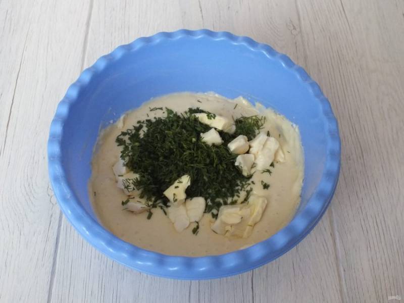 В тесто добавьте укроп с сыром и размешайте ложкой.